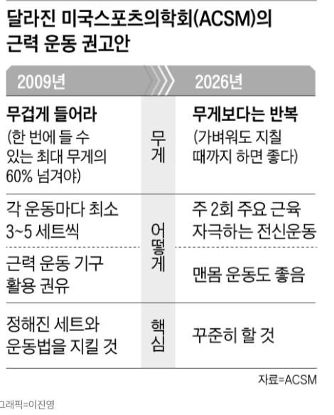 연구팀은 또한 운동할 때 가장 ‘효율적이고 가성비가 좋은 횟수’는 주 2회라고 봤다. 주 5회씩 고강도 운동을 한 그룹과 주 2회라도 꾸준히 운동한 그룹을 1년 뒤 비교해 보면, 근육량이나 심혈관 건강에 큰 차이가 없었다는 것이다. 연구팀은 “주 0회에서 주 2회로 운동을 늘릴 때 얻는 이득이 100이라면, 주 2회에서 주 5회로 늘렸을 때 얻는 추가 이득은 10~20 정도였다”고 했다.