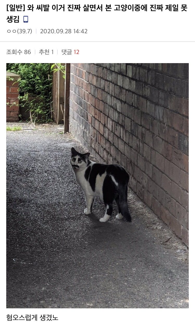 저 고양이도 지나가다 중붕이보고 '와 저 X끼 내가 본 인간 중에 제일 혐오스럽게 생겼네' 그랬을지도.