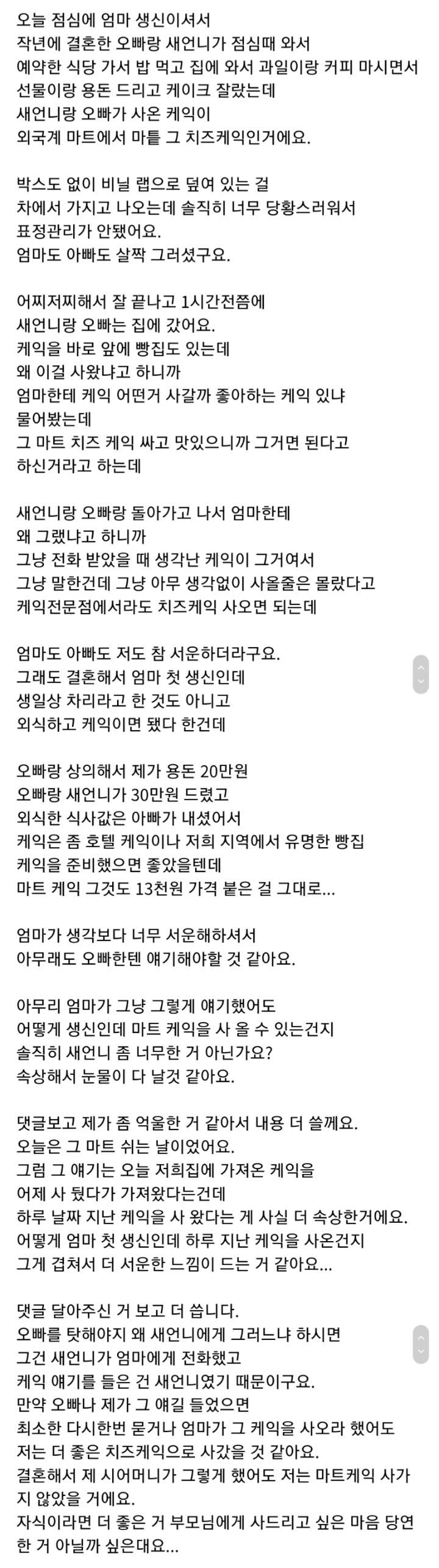 저기서 정답은 어머님 제가 더 맛있는데 어렵게 찾아서 사왔는데 한번 드셔보세요 하고 3~5만원정도의 케잌을 드렸다면 아주 칭찬받았을 것이다