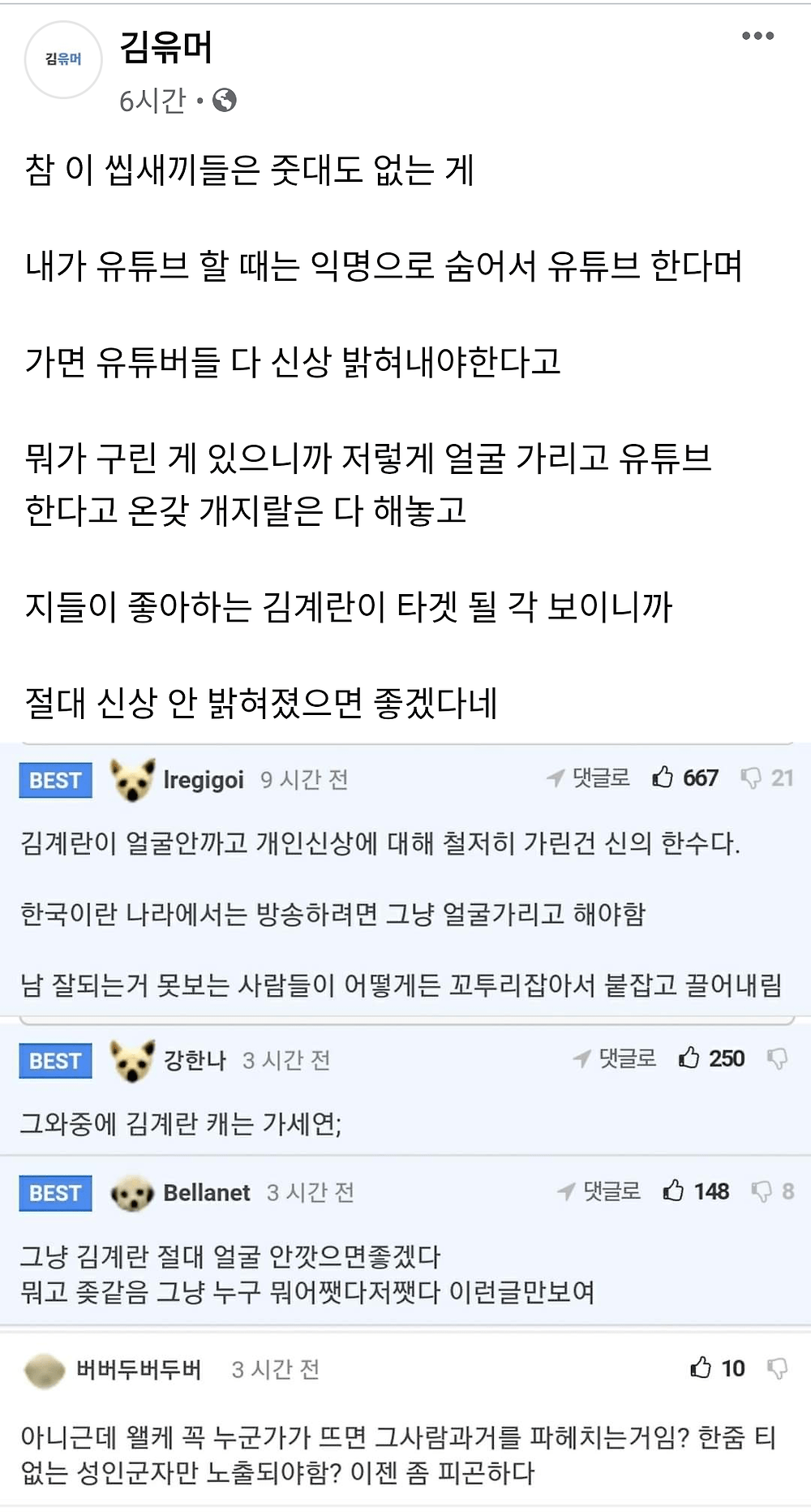 단순히 얼굴가리고 활동하는거랑 얼굴가리고 남을 비방하는거랑 동일선상에서 생각을 하네...
