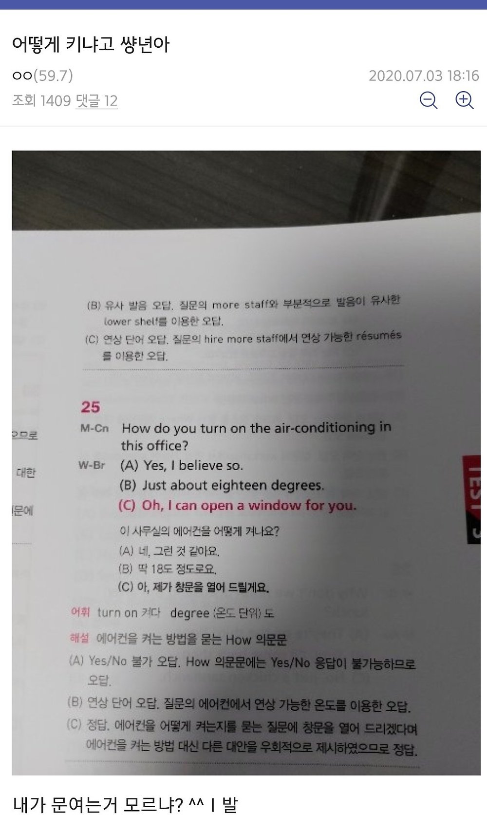 에어컨을 켜는 이유가 덥거나 습해서인데 더운날에 창문을 열면 더 더워질수 있고 습한날에 창문을 열면 더 습해질수 있음 명백한 오답아닌가