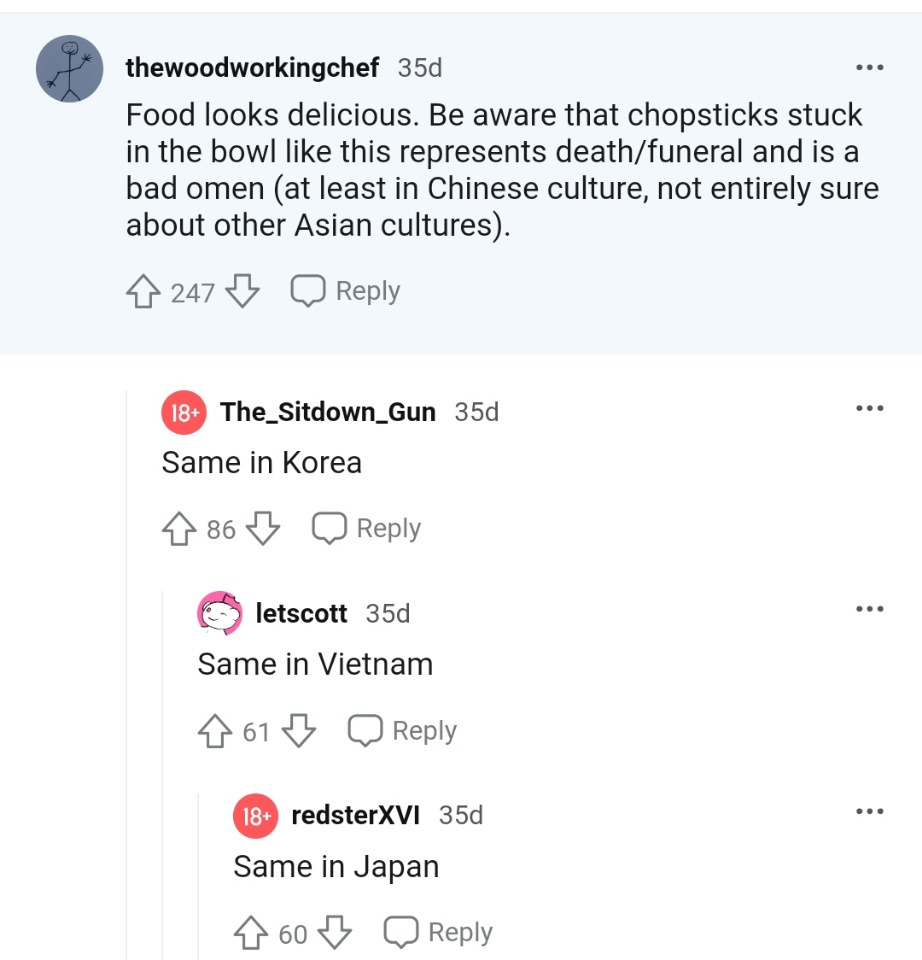중국인: 음식은 맛있어 보이는데 중국에서 젓가락 꽂으면 제삿밥이라고 해서 안좋은 뜻이야