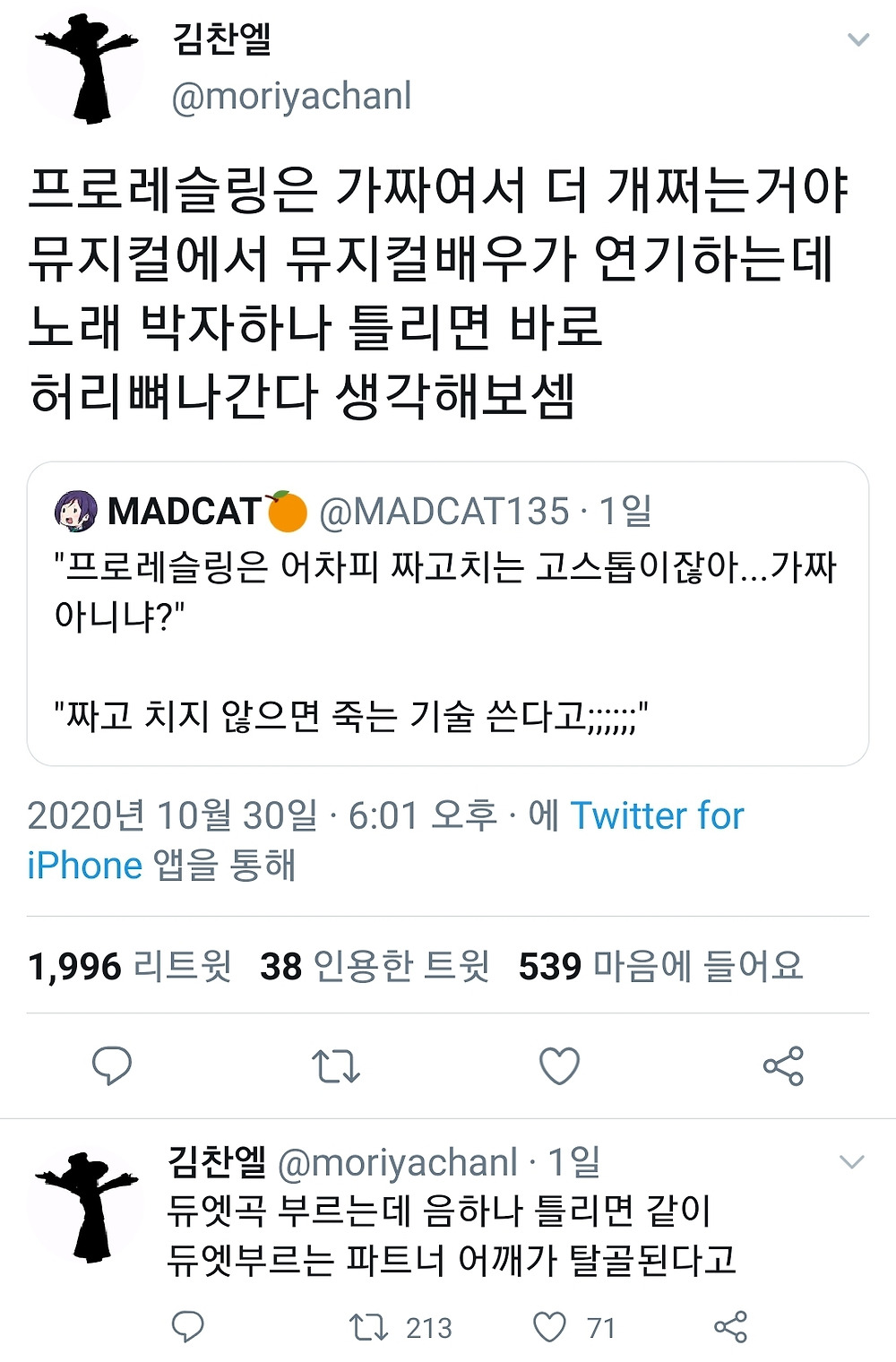 라이브로 액션영화 찍는다고 생각하면 됨 짜고 하니까 안 다치는거지 기술 하나하나 그대로 처맞으면 그냥 디지는데ㅋㅋㅋㅋ 그와중에 실수하거나 합 못 맞추면 목 나가거나 허리 나가거나 사고나는거고