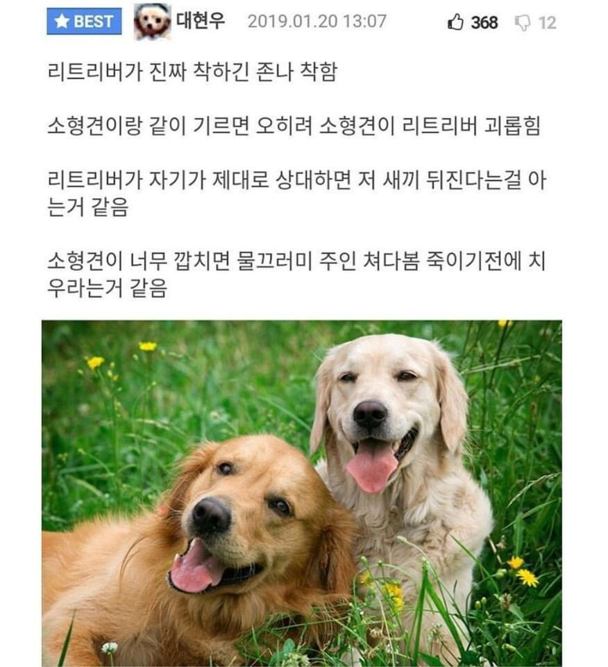 골든 리트리버가 사람한테만 착하지 다른동물들한테는 제법 위협적이라는데 개중에서 전투력 중상위권은 되고