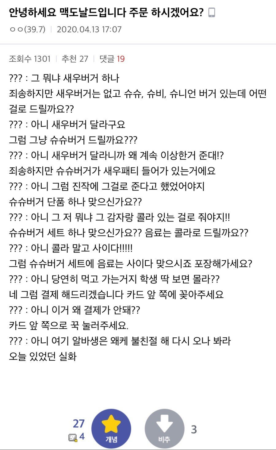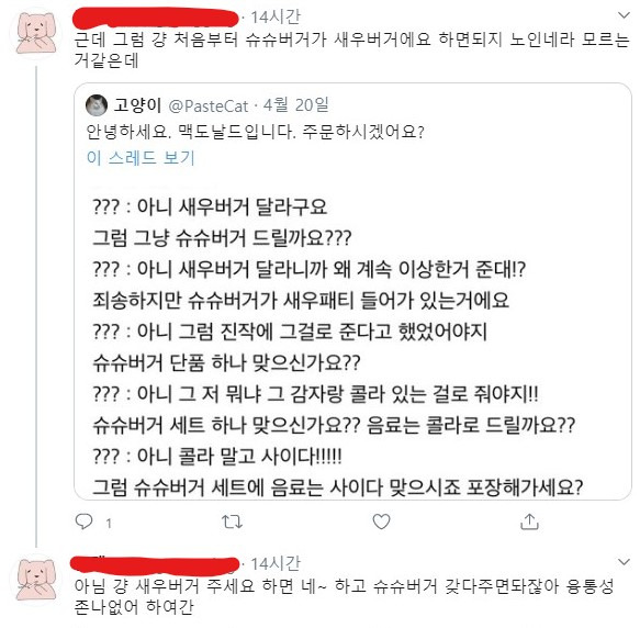 난 알바가 1차적으로 잘못했다고 봄 걍 슈슈버거가 새우버거에요 한마디만 했으면 저렇게까지 갈 일이 없는데 나이 드신분들이 주문서 봐도 모른분들 뭐가 뭔지 모를수도 있다고 봄