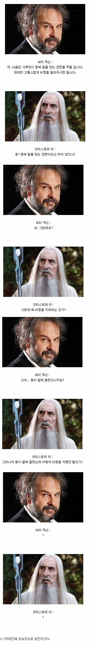 크리스토퍼 리 경께선 실제로 등에 칼이 찔리면 바람빠지는 듯한 신음 소리를 낸다고 하셨답니다. 2차 세계 대전 당시 실제로 보신분이니;; 첨언하자면 반지의 제왕 원작자인 톨킨을 실제로 만났던 배우기도 하다는 점이죠.