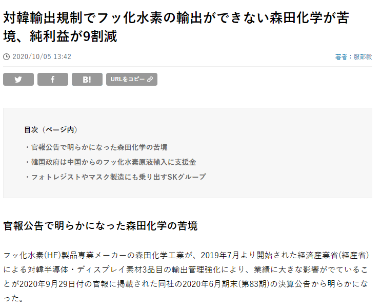 일본 오사카(大阪)시에 본사를 둔 불화수소 전문업체 모리타(森田)화학공업이 일본 관보에 공개한 2019회계연도(2019년 7월∼2020년 6월) 실적을 30일 연합뉴스가 확인해보니 순이익이 전년도보다 90.2% 감소한 약 7천867만엔(약 8억7천만원)이었다.