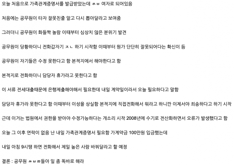 하여튼 씨발 ㅋㅋㅋ 일처리 좆같이 하네 공무원 놈들