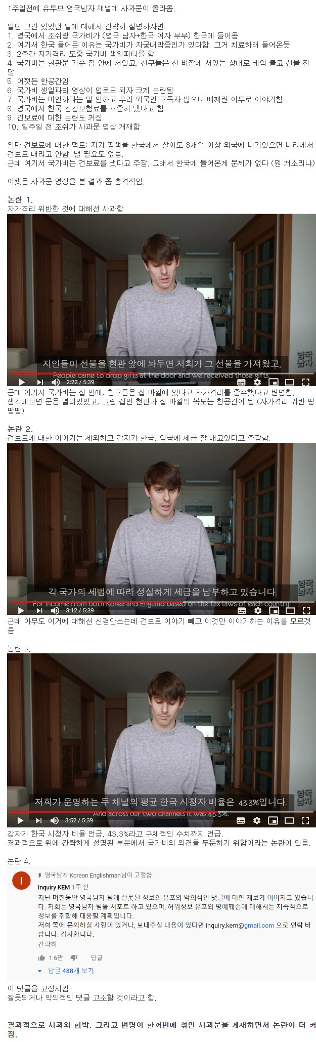 저거 채널가보면 하루종일 상주하면서 쉴드 치는 애들있음 그리고 그렇게 한국말 잘하는분이 갑자기 영어로 이야기 하면서 한글과 영문의 사과 늬앙스가 달라서 흡사 해당 채널을 보는 외국인들에게 일러바치는거같은 느낌임 그래서 그런가 영문으로 댓글다는 외국인들은 한국사람들이 너무 예민하게 군다고 한국사람들을 까고있음 ㅋㅋㅋㅋㅋ