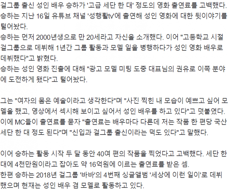 [유머] 걸그룹 출신 만 20세 에로배우 편당 출연료