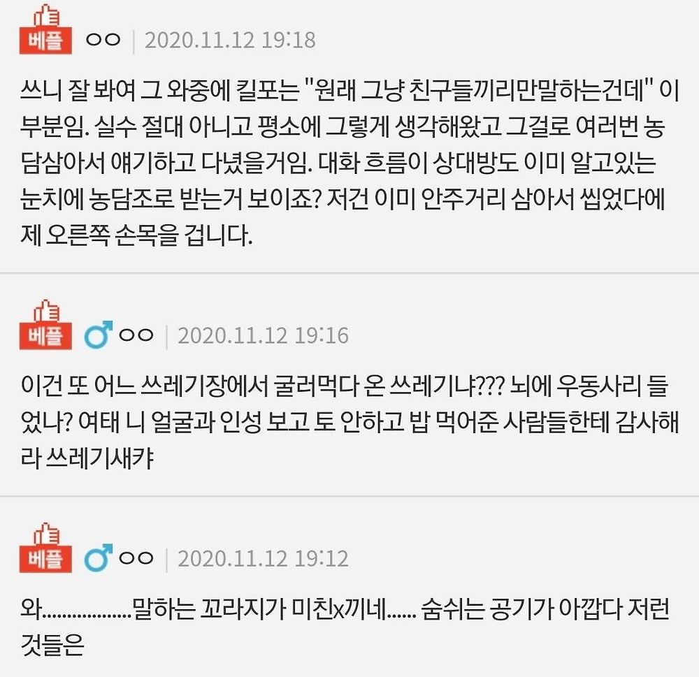 친구들도 그걸 좋다고 듣고 같이 지껄이고 있었는데 친구들 수준까지 드러나는것 같은데...친구가 저런 소리하면 그런말 하지 말라고 말리지는 못할망정 ㅋㅋㅋ 끼리끼리 노는 애들이네