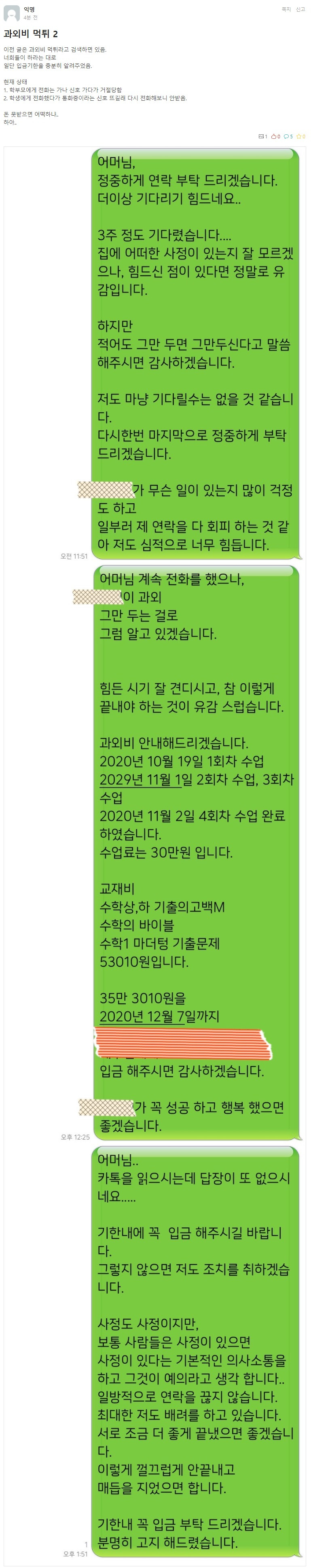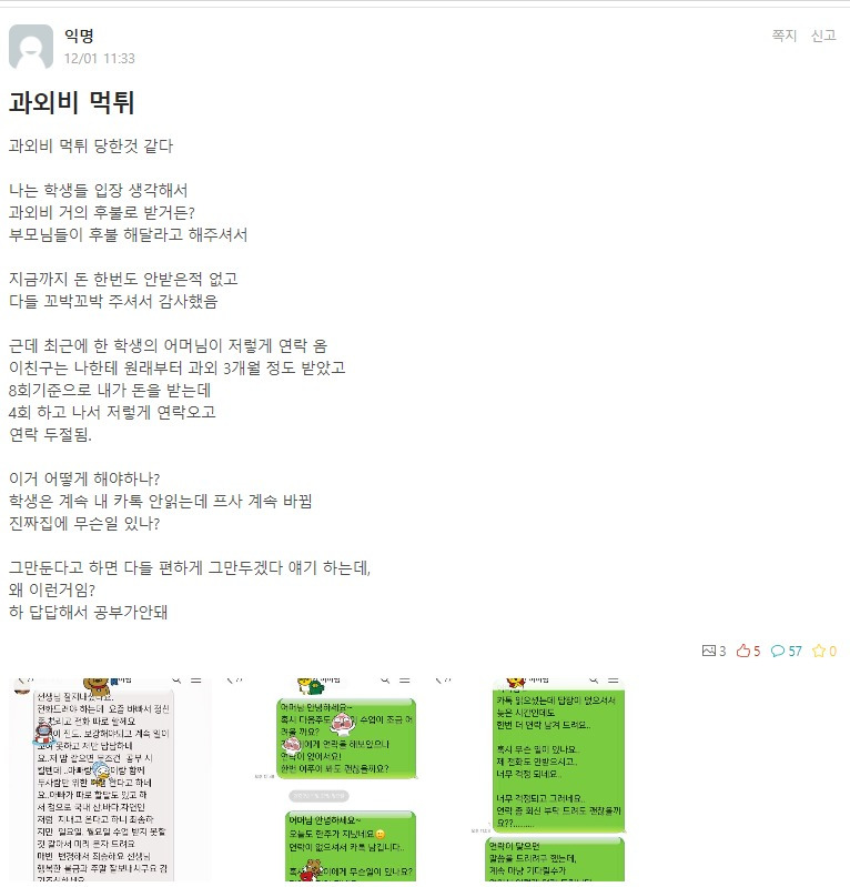 후불로 받은게 잘못이지 과외도 따지고 보면 불법에 속하는거라 저건 어찌한다해도 못받음 과외, 개인레슨 같은건 하늘이 두쪽나고 바다가 갈라진다 해도 무조건 선불로 받아야함