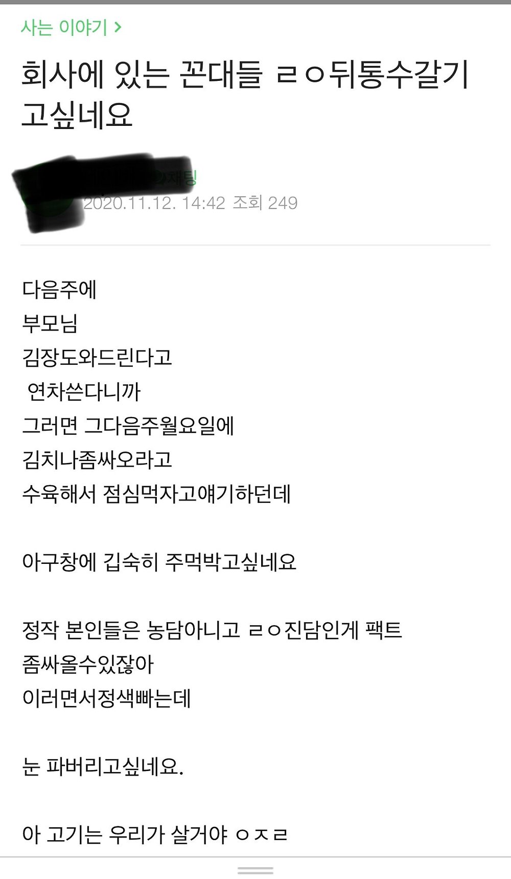근데 진짜 좀 싸와서 같이 먹을수 있는거아닌가.... 여초직장이다보니 직장들 마다 항상 누구 김장한날은 말안해도 싸와서 수육먹었던... 3번 옮겼는데 3번 다 그랬음...
