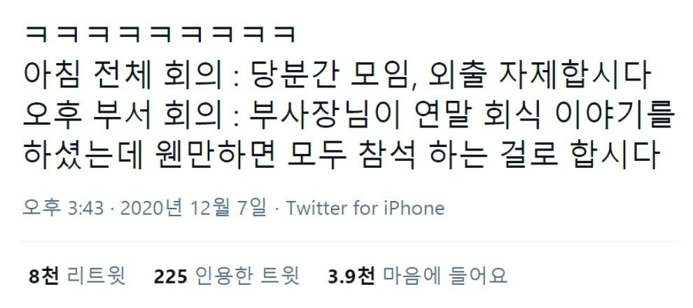 회식은 꼬박꼬박 하는거 ㅈ같음 진짜