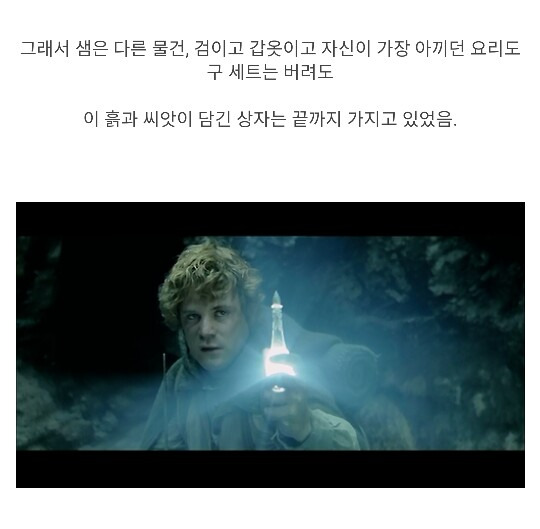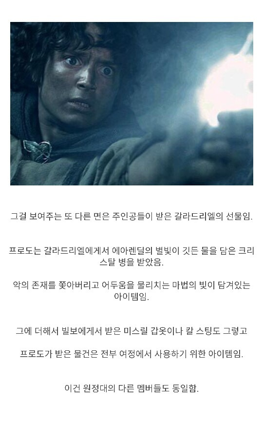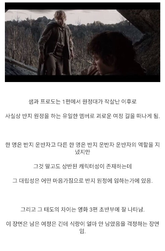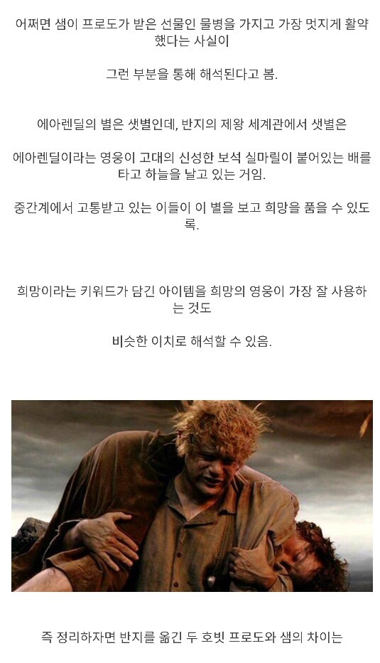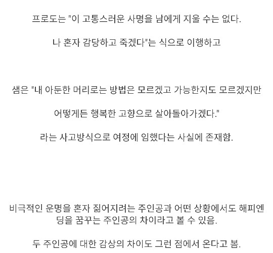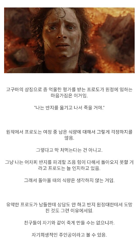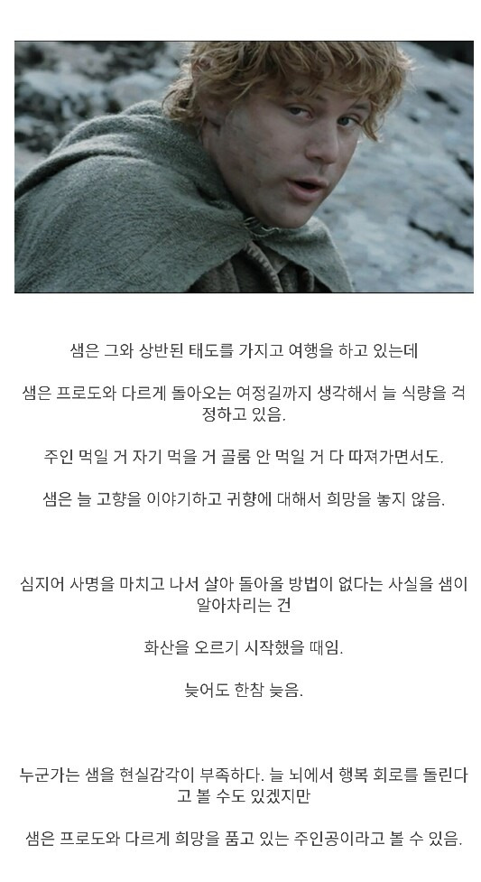 호빗의 신체조건으로 끝까지 반지를 운반한 프로도, 샘 둘 다 대단하다고 느낌. 그에 못지않게 카메라맨처럼 모든 여정을 같이 소화하며 추가로 조력자 역할을 한 샘도 임무에 있어서 없었으면 성공하지 못했을 정도로 중요한 인물인 것임. 그래도 매 순간 반지의 유혹을 이겨내는 사기급 정신력의 소유자 프로도가 가장 큰 역할이지 않았나 싶음