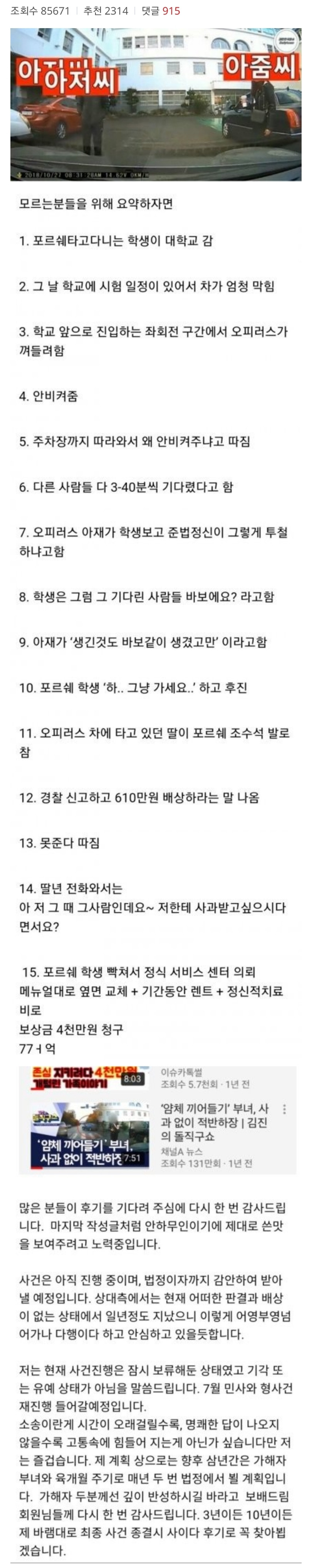 근데 운전 진짜 개병신같이 얌체처럼 하면서 양심 없는 새끼들 존나 많다. 저게 포르쉐였으니 망정이지 시발 아반떼였어봐라 저 상황이 나오나. 자율주행생기기전에 썬루프에 로켓포 장착해서 노매너 운전자 대가리 터트려도 합법해야된다 ㄹㅇ