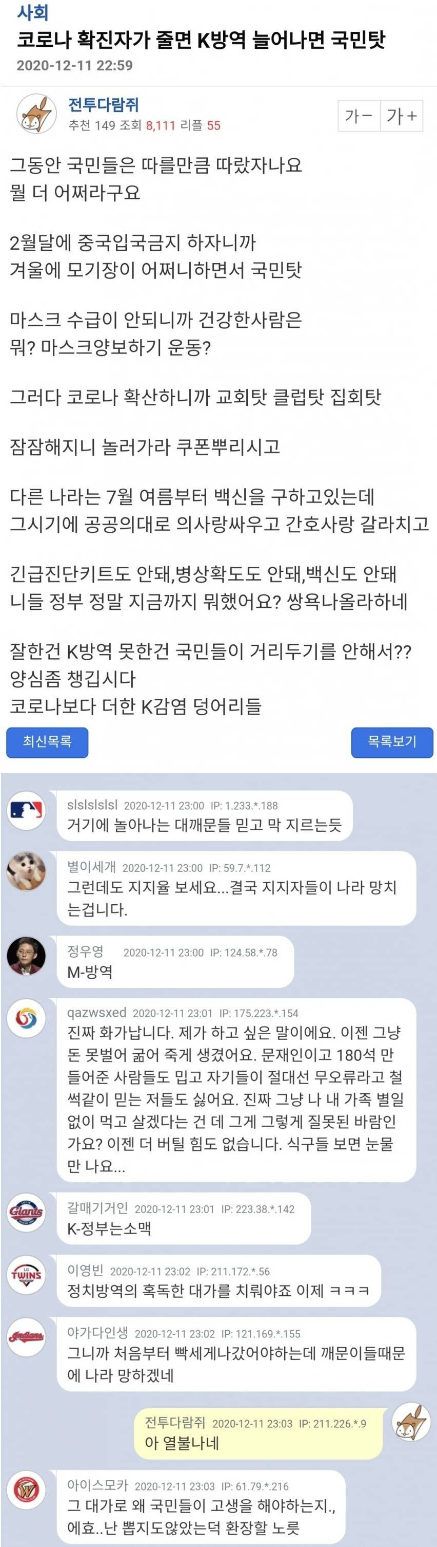 잘될 때 안 될 때 모두 국민탓 맞음. 국민 때문에 방역 잘된거고 국민때문에 방역안되는 것임.