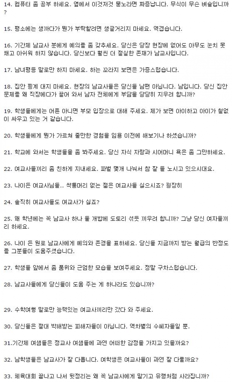 8. 인사좀 하세요 자기에게 영양가 있는 사람에게만 말구요. 15. 평소에 쌩까다가 부탁할때만 생글 거리지 마세요. 와..ㅋㅋㅋㅋ 이건 그냥 회사생활 하면서 여직원 있으면 느끼는ㅋㅋㅋㅋ 한번 15번 처럼 굴길래 8번한테 가서 말하라고 한적있음ㅋㅋㅋㅋㅋ
