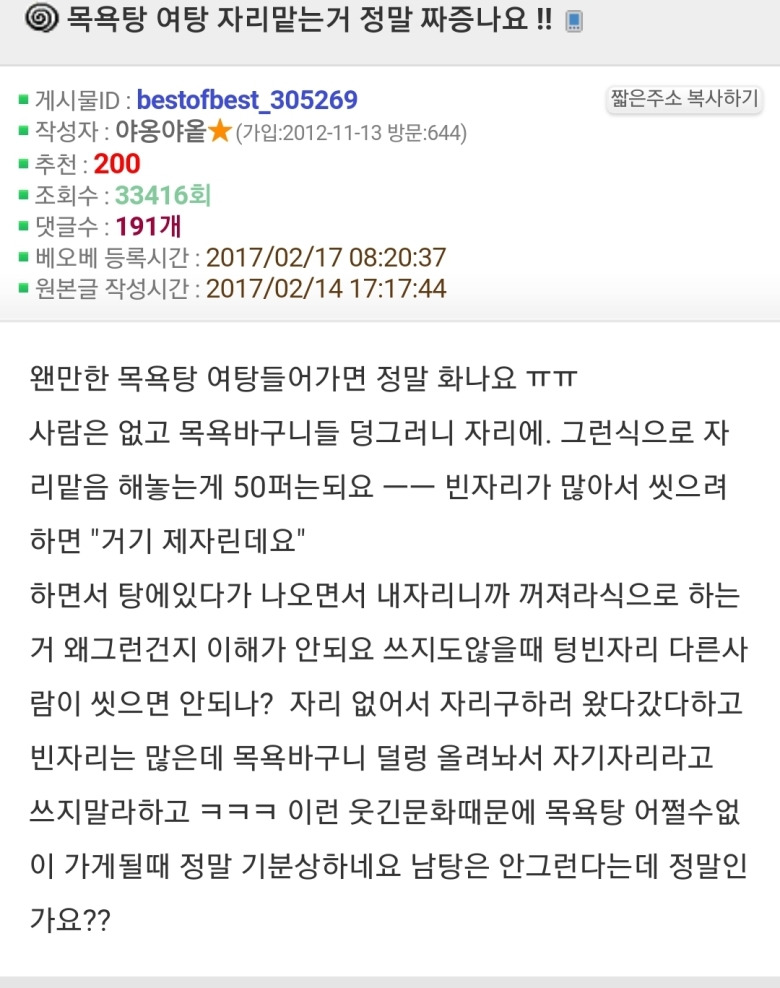 옛날에 목욕탕가면 자리 맡지도 않고 걍 빈자리서 샤워먼저 조지고 탕에 들어갔다가 다시 나올때 아무자리 앉았는데;;