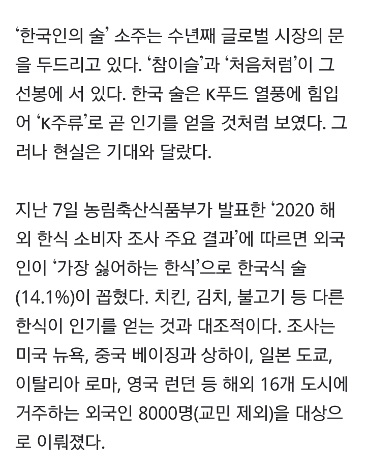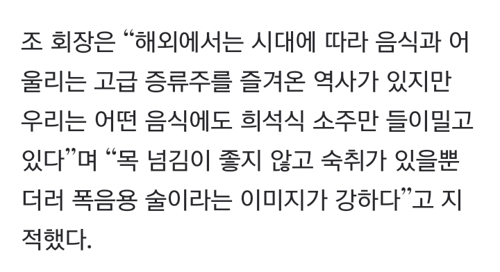 맛보단 저급인거지. 무슨 화학술임 이게 한국 대표 술로 밀어붙이는게 이해가 안됨. 안동소주나 이런게증류주지 위스키 보드카 럼 데킬라 진 이런 증류주도 아니고. 와인 맥주 막걸리 청주 사케 같은 발효주도 아니고. 걍 공업용술임.
