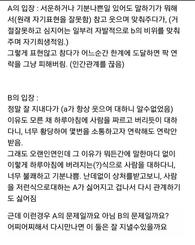 이미 글을 A가 잘못이고 B는 억울하다 식으로 썼으면서 왜 물어봐 답정너인가