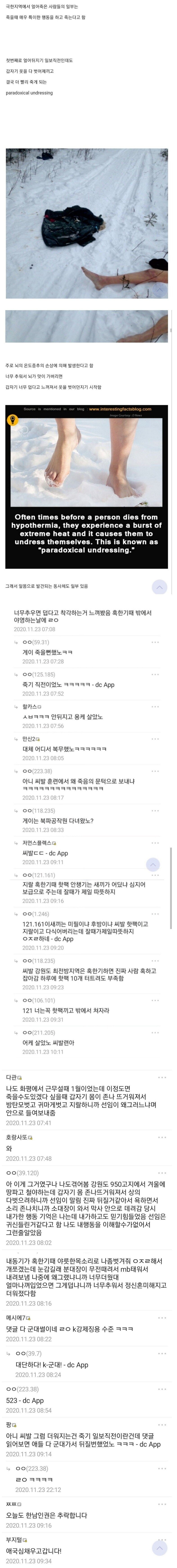 와 그런거야? 나도 한번 느꼈는데 공군 댕길때 활주로 공사한답시고 겨울밤에 눈비 맞아가며 몇시간동안 일하다 너무 추워서 어디 걸터 앉아있었는데 갑자기 따뜻함이 느껴져서 졸음이 솔솔 오다 누가 불러서 깼는데;; 훅갈뻔 한건가;
