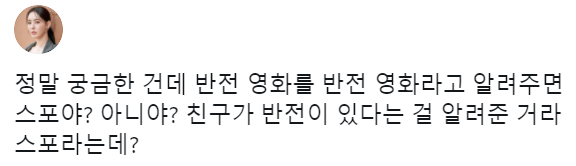 사람에 따라 다른데 그 말 꺼낸 친구한테는 스포임. 스포 싫어하는 사람은 그 말만 들어도 영화보는 내내 반전 생각 할 꺼라서, 집중도 해칠듯.