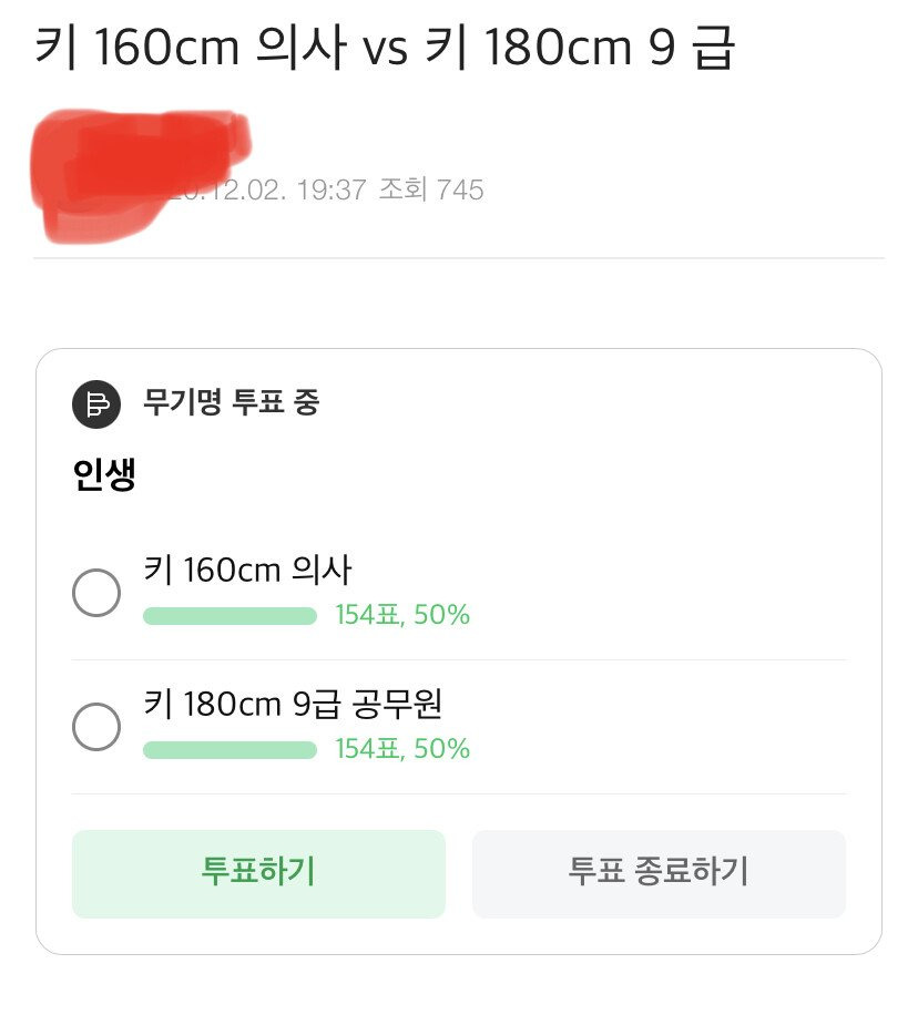 의미 없는게 저런 사람이 본인 만나는 주냐? 180cm이라는 외모 조건에 9급공무원을 굳이 집어 넣은 걸로 봐서 경제적 안정감을 엄청 중시한다는게 느껴짐. 고민 잠깐하고 글쓴x은 무조건 의사 택할듯.