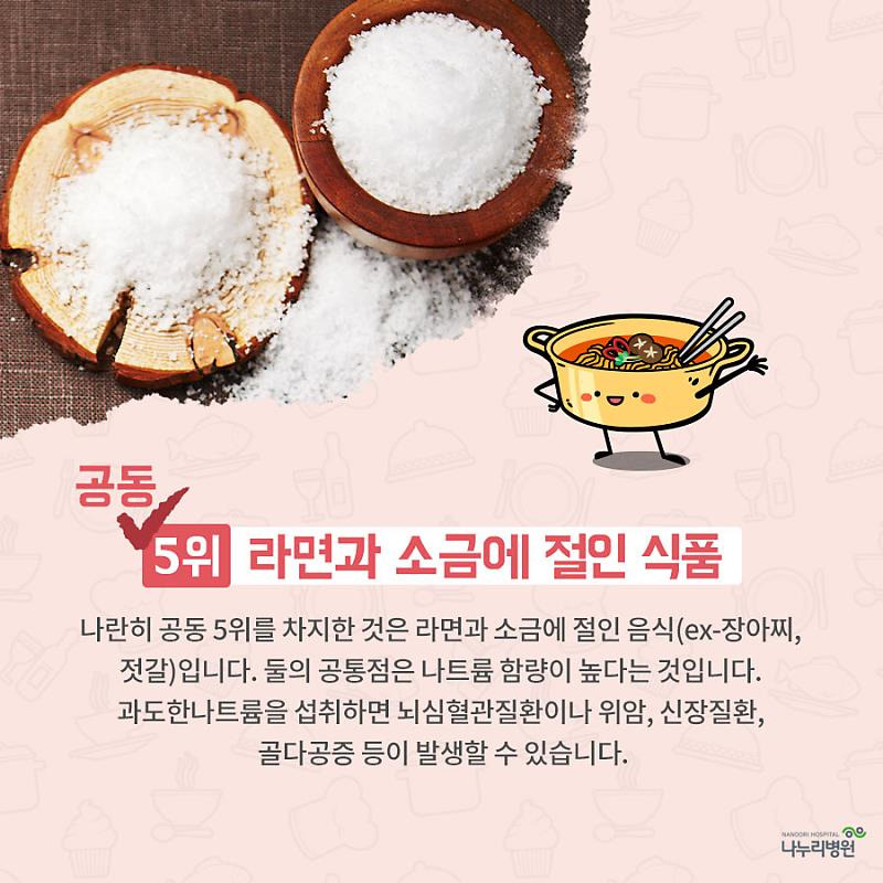 5위 소금에 절인 음식 김치가 일상에서 가장 많이 접하는 음식일 듯