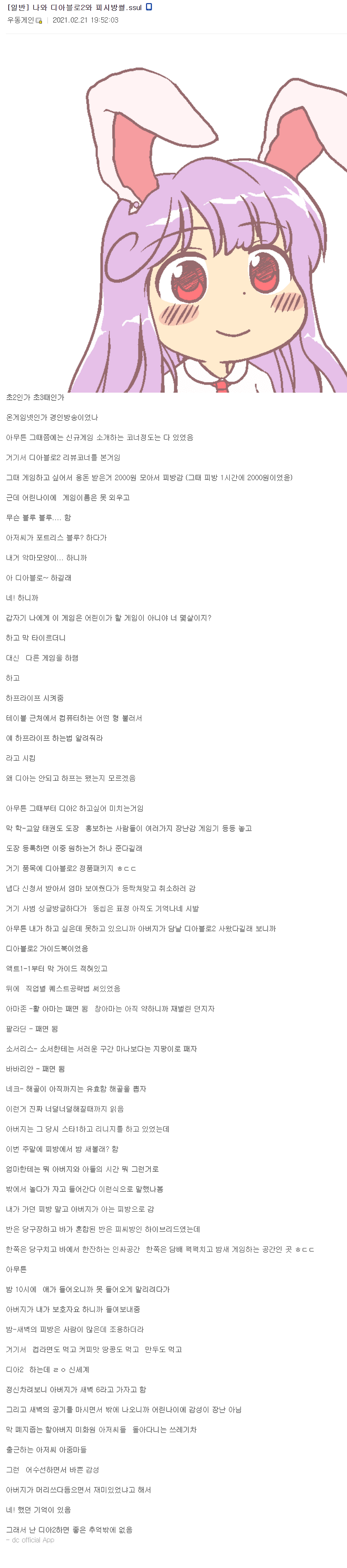 쓴이처럼 어릴때 추억하면 PC방에서 디아2 밤샘 해봤던 기억이 좋은 추억 베스트5 안에 꼽힘