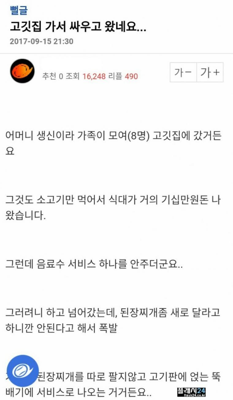 쁘락꾸// 이 병신새끼는 뭐라는거냐 치킨 시키면 주는 양배추 샐라드랑 고기 시키면 주는 된찌랑 뭐가 다르다는거야? 시키면 기본찬으로 나오는게 똑같은데 시발ㅋㅋㅋ 그냥 지나가려고 했는데 끝까지 개소리 지껄이네 병신새끼야 아 진짜 이새끼랑 말 섞은 내가 병신이지 ㅋㅋㅋㅋ