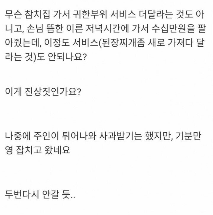 된장찌게 하나 리필해주면 그게 나중에 몇십 몇백만원이 되어 돌아올지 모르는 상황이 될지 모르는게 저 바닥 논리인데.