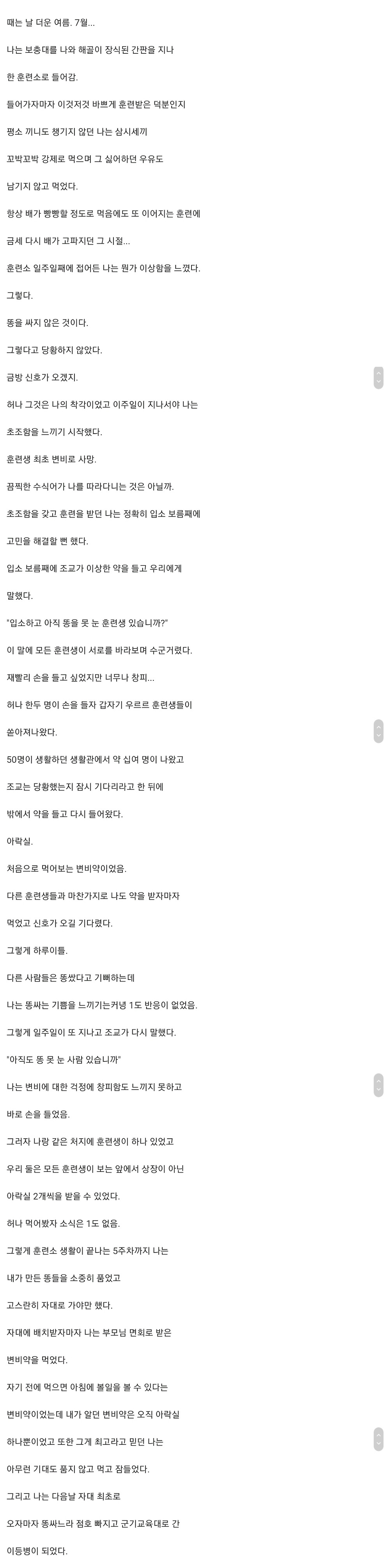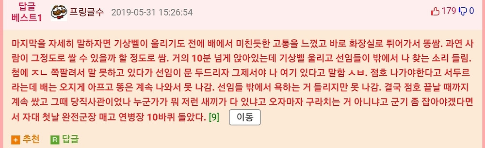훈련소때 일주일간 똥 못싼적은 있는데 5주는... 그리고 자대가서 px냉동식품 먹기 시작하니까 설사 존나함ㅋㅋㅋㅋ