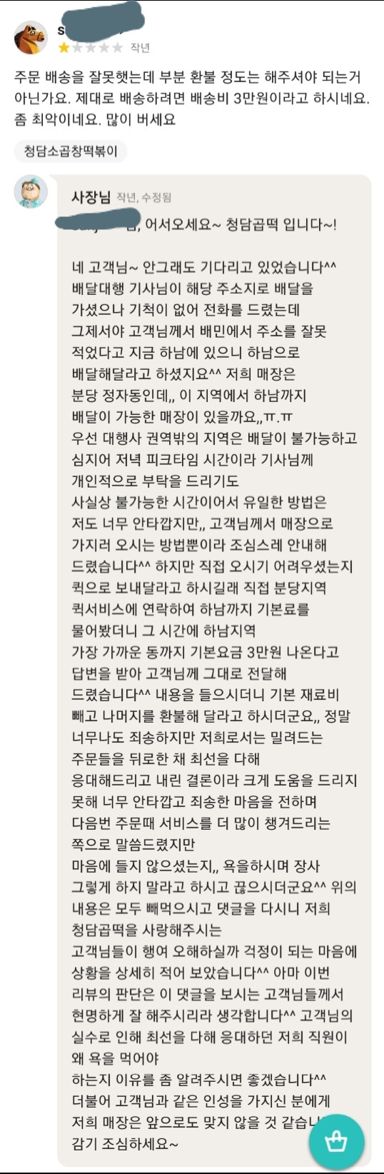 물론 사람이니까 실수할 수도 있다 본인이 실수한거니 죄송하다고 사과하면 서로 기분 나쁠 일도 없는데 저런 새끼들 종특인지 뭔지 미안하다는 말은 커녕 배달비 추가로 왜 줘야 하냐 음식 다 식었는데 이걸 먹으라 하냐 이지랄 하는 새끼들이 태반이더라 나도 몇 번 당해봤는데 사과한 사람 딱 한 명 있었고 그사람은 단골이라 아직까지도 배달시켜 먹음 사과 없이 그냥 처먹는 새끼들은 그이후로 배달 안 시킴 ㅇㅇ