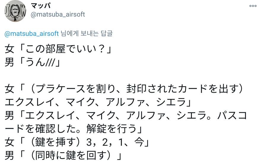 남자 '엑스레이, 마이크, 알파, 시에라. 패스코드를 확인했습니다. 잠금장치를 열겠습니다'