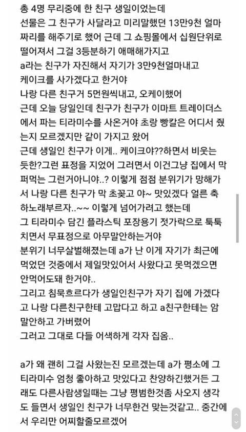 아니 14만원을 나눠서 내기로 했는데, 케익사오는 수고를 한단 이유로 친구들이 5만씩 더 많은 돈을 부담하고, 케익산 친구는 3만9천 내라했는데 어라, 1만원 짜리 케익 사왔네????