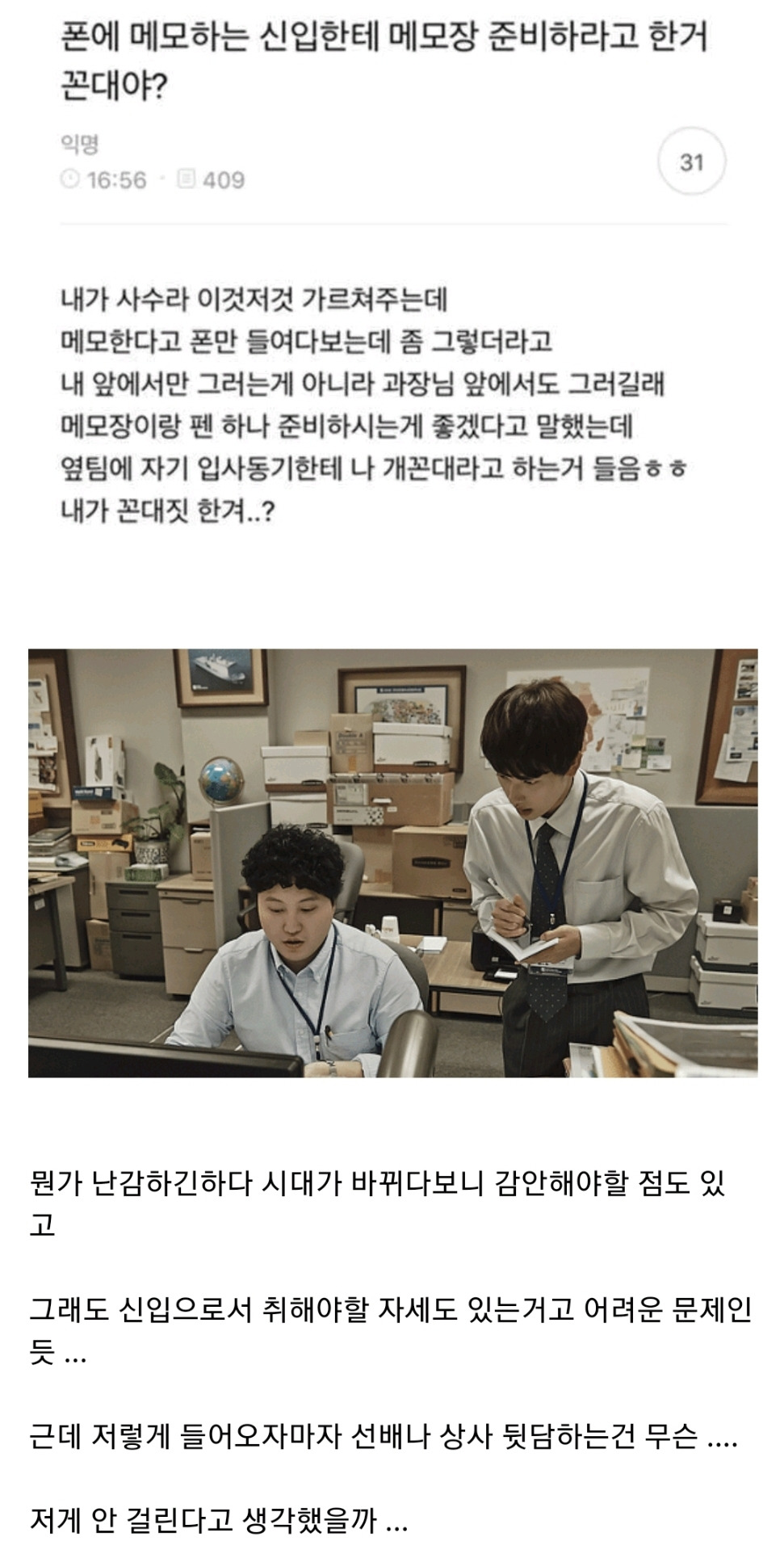 정말 저 내용이 끝이면 겨우 저거가지고 꼰대니 뭐니하는 신입이 답이없는거같은디