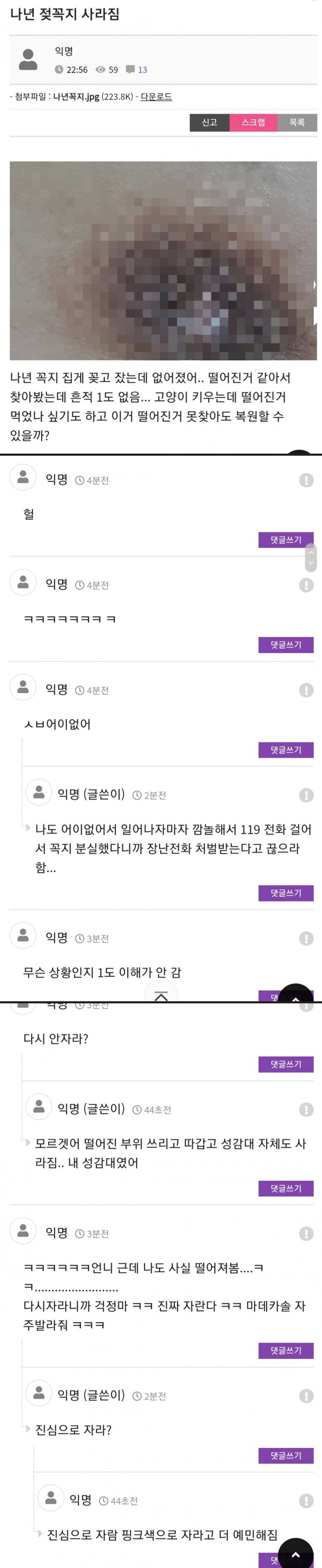 아니 집게를 왜 꽂고 잔대요... 그리고 젖꼭지가 없어지면 유륜에 있는 오돌토돌한 것들이 스페어 젖꼭지가 된다고함. 친구가 면도기로 젖꼭지 잘라봐서 생생하게 알려줌.