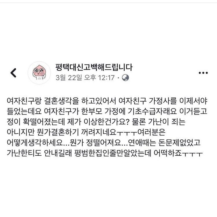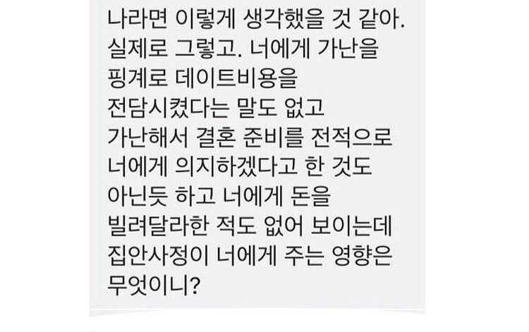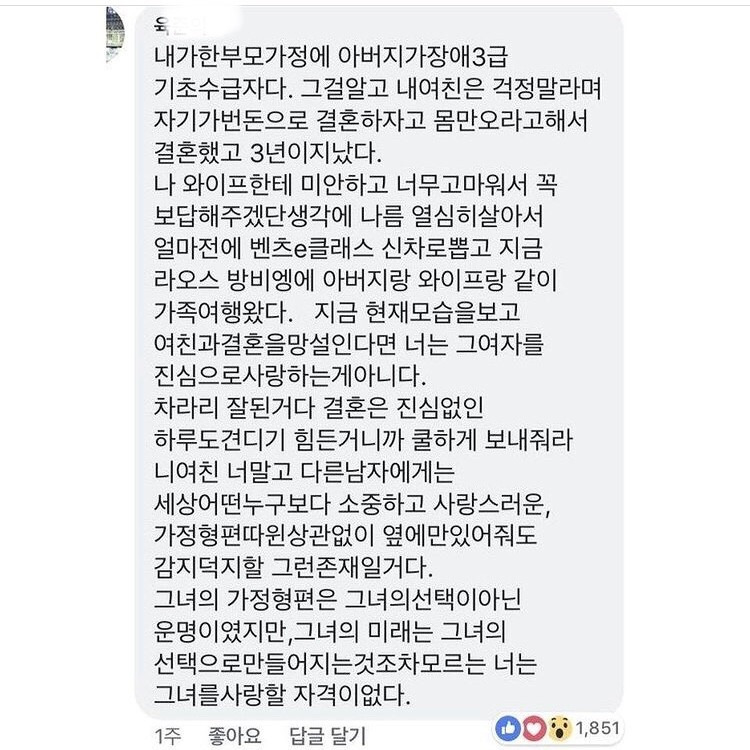 저건 여자가 남자인척 하면서 쓴글인듯 남자는 가난하고 뭐고 신경 잘안씀 무히려 여자가 남자가 가난해요 ㅠㅠ 라고썼으면 당장 갈라지라고 개거품물면서 댓글달림 씹버러지년들 ㅋㅋ