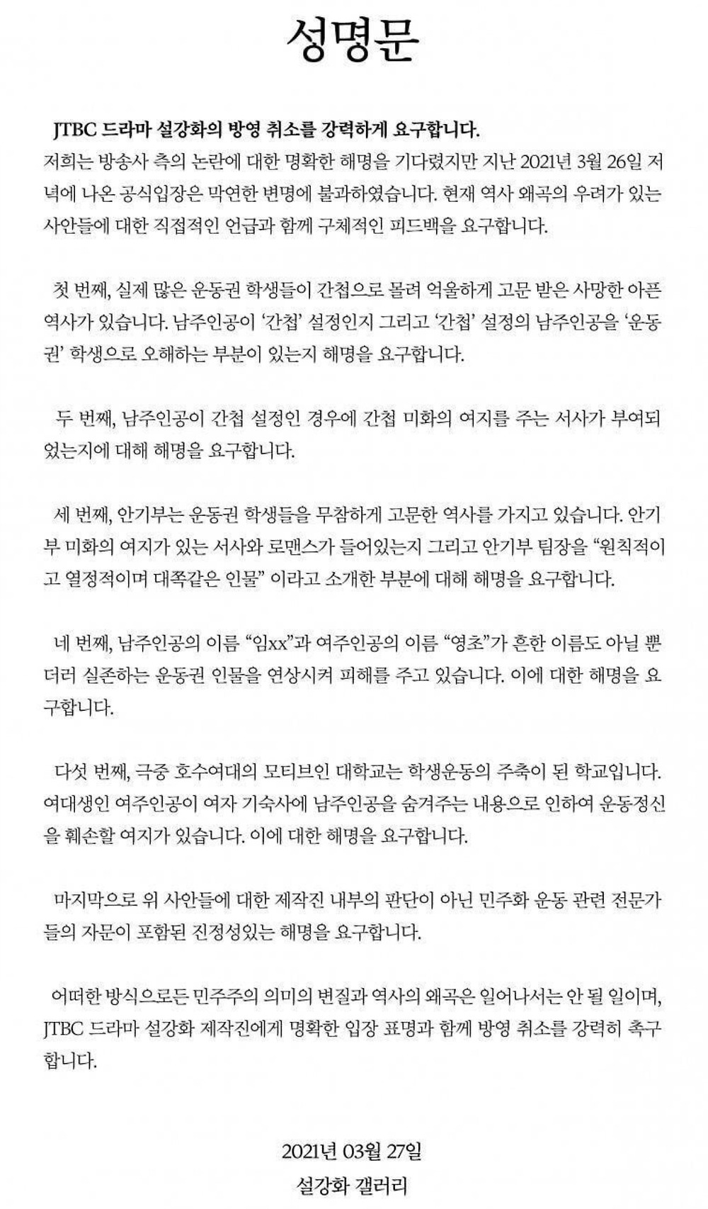 [유머] 설강화 갤러리 성명문