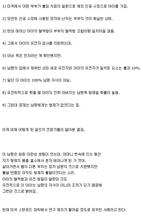 관련은 적지만 태어난 태아가 다른 수정된 태아를 몸에 품은 채로 태어나는 기태류 라는 것도 있던데 사람 몸은 연구해도 끝이 없는듯.