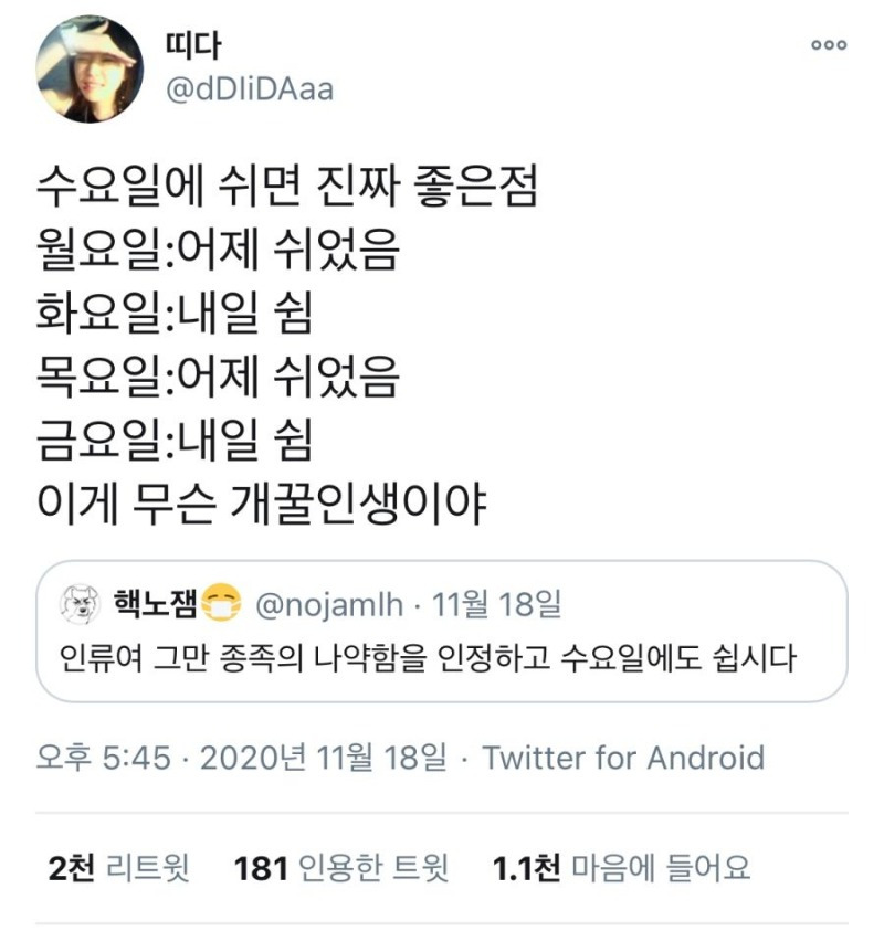 수요일: 아- 내일 또 일나가야 하네 ㅈ 같네