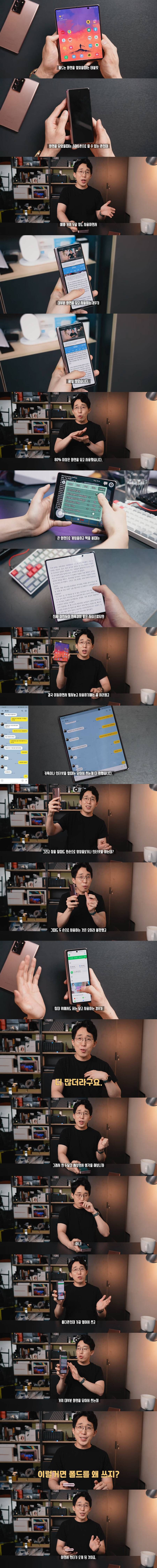 핸드폰은 항상 최신폰 쓰는데 폴더블은 진짜 관심이 1도 안갔음 딱 저럴꺼 같았기 때문에 영상 볼때 좋다고 하는 사람들 있던데 애초에 접할수 있는 영상이 21:9나 4:3밖에 없어서 화면에서 넓어지는 부분이 거의 없다시피함 텍스트 읽을땐 좋긴 할텐데.. 그돈이면 폰 사고 패드 하나 더 살수 있음