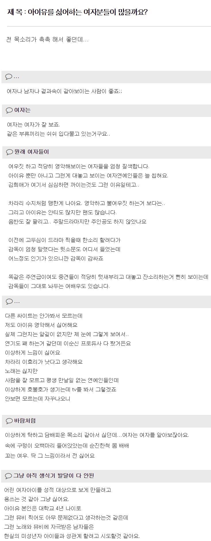 ㅋㅋㅋㅋ 목소리 담배피는거 같구 만나본적 없지만 여우짓하는 겉과 속이 ㅋㅋㅋ 다른거 같고ㅋㅋ 여자아이를 성적대상으로 보게 만들려는거 같다고? ㅋㅋㅋㅋ