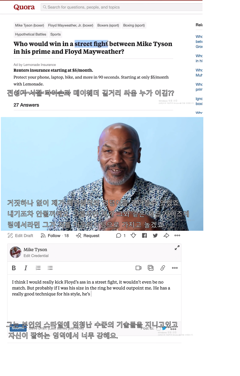 너무 겸손해 지셨네.....같은 체급이였으면 가드 안뚫어도 메이웨더가 빠르게 포기 할거 같은데....