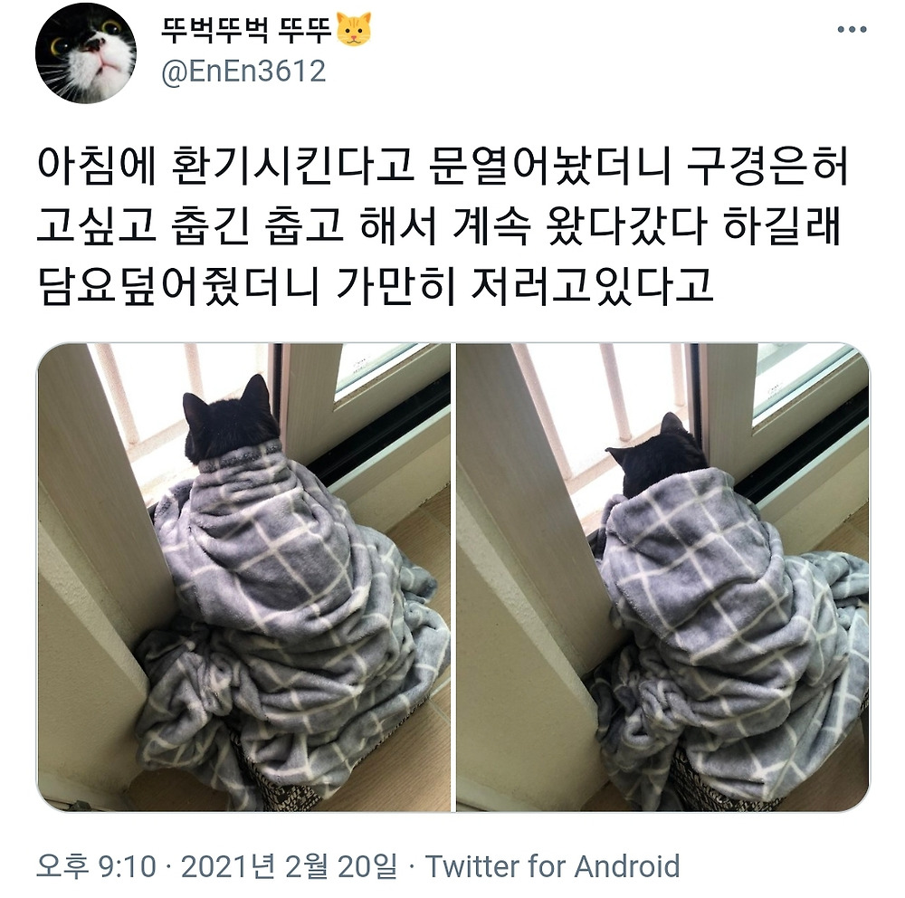 [유머] 바깥구경 하고는 싶고 춥기는 추운 냥이