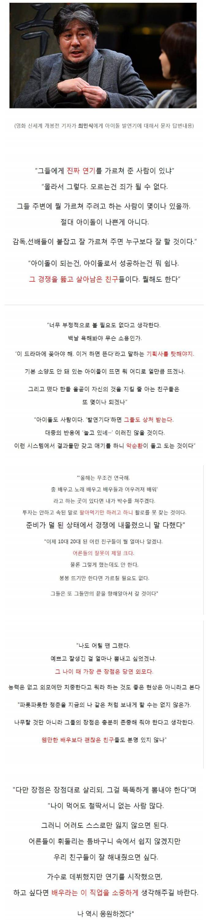 정식배우들 무명시절 썰들 생각해보면 정식으로 연기 배워서 스크린에 세우기까지 걸리는 시간과 노력은 상당할 것임 근데 아이돌들은 노래부르고 춤춰서 얻은 인기로 자리를 만들어넣고 꽂아 넣는 시스템이라 당연히 연기력 논란 생길수 밖에 없다고 생각함