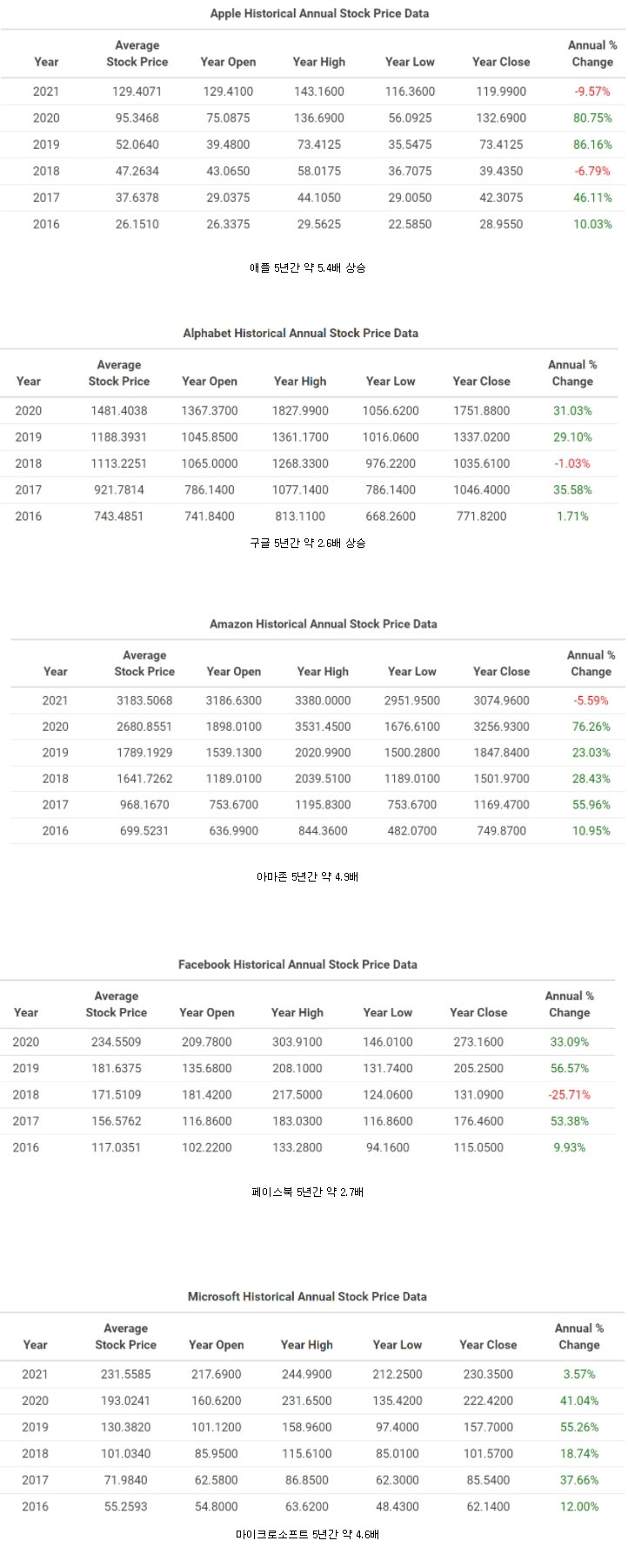 [유머] 미국 대표 기술주들 지난 5년간 주가 추이