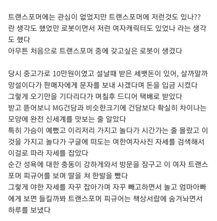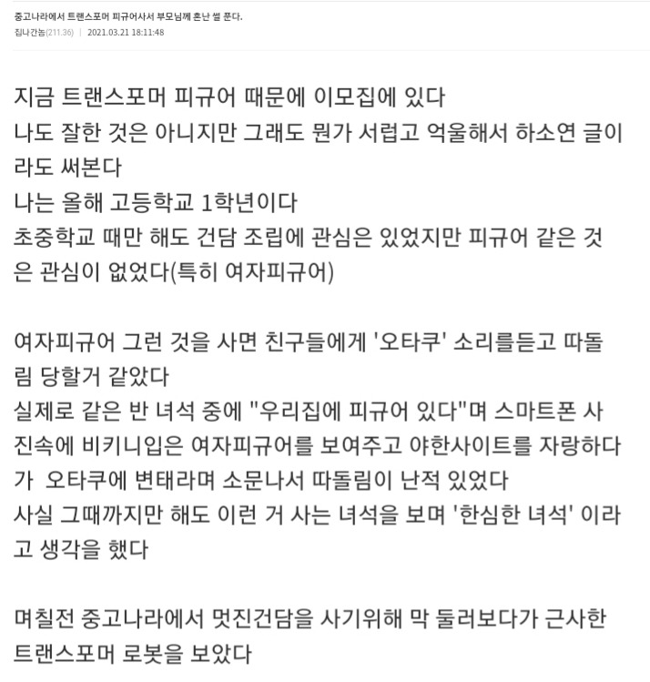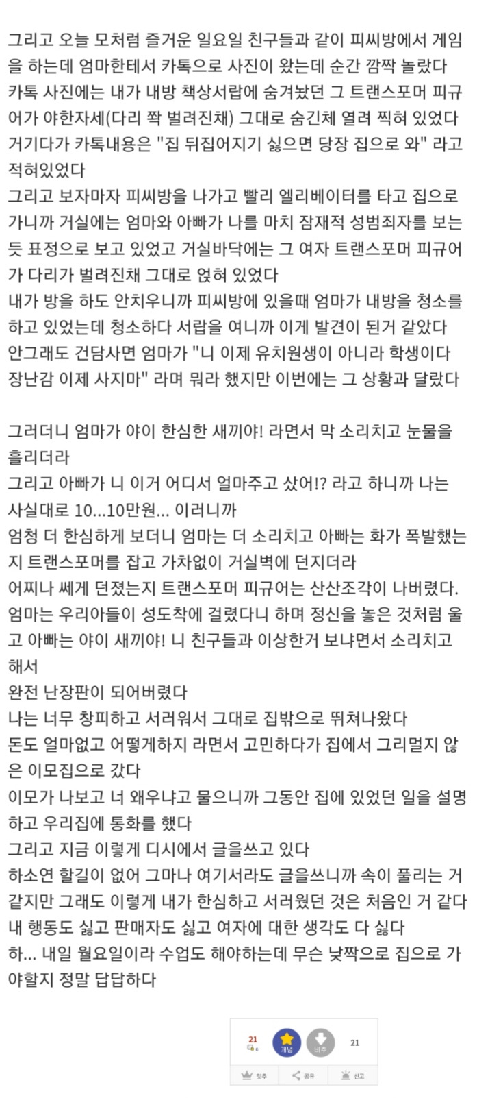 자식이 조금이라도 자기들 눈 밖에 나면 하는 행동을 하네. 왜 샀는지, 무슨 이유가 있었는지 정도 한마디를 안물어봐. 글에서는 저 피규어로 한발 빼서 가 초점이 될지 모르지만, '너 유치원생이 아니라 학생이니 장난감 사지마' 라는 대목에서 정말 불쌍했음. 자라는 시기엔 무조건으로 억압하면(그럴듯한 이유만 붙여서) 후에 그쪽으로 도착이 생기는 경우도 있다고 들었는데, 정말 안타깝다...