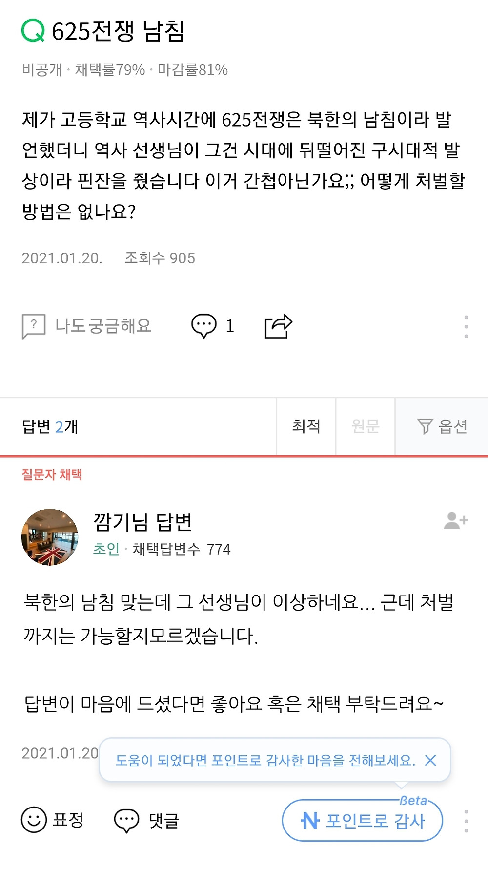 역사는 주관이 담기지 않아야 되는데, 역사 선생이란 사람이 명백한 역사적 사실에 대해 '어 그건 아니야' 라고 단정 짓는게 웃기네. 시대에 뒤떨어진 구시대적 발상이라 했는데, 그럼 시대착오적이지 않고 신세대적인 발상은 북한도 평활 원했는데 소련과 중국 등 공산국가의 압박을 이기지 못해 '어쩔 수 없이' 남침한거다. 뭐 그딴 개소리하려는걸까?